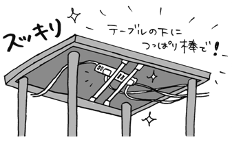 スマホの充電器やパソコン、プリンターの電気コードなどは絡まりやすく、ごちゃごちゃしがちで見た目にも美しくありません。そんなときに便利なのが突っ張り棒を使った収納法。テーブルの下に突っ張り棒を二本並べて渡し、その上に電源タップを置きます。... -