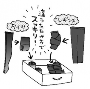 例えばタイツは「縦に二つ折りしてからロール状に」、レギンスは「結んで」収納すると、すぐに見分けることができます。