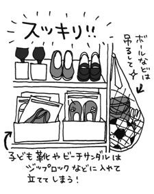ボールやおもちゃはネットに入れ、下駄箱や壁にフックを付けて吊り下げます。
